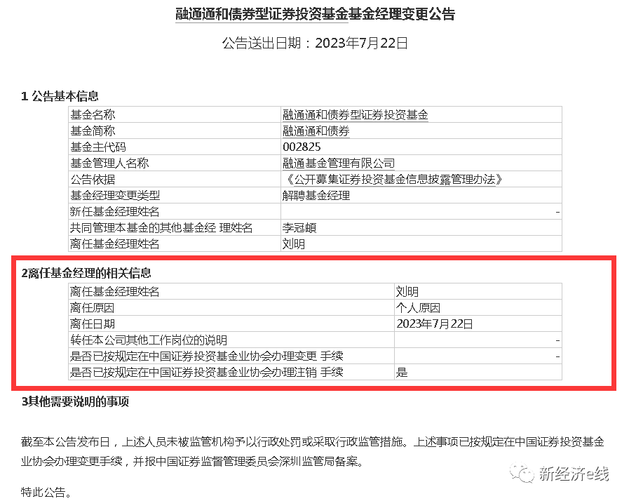 就在今年6月,融通基金原固定收益部總經理趙小強宣告離任,卸任了其管理的全部8只基金的基金經理職務,分別包括融通通源短融(A/C)、融通通祺(A/C)、融通增輝定期開放、融通增悅、融通通璽、融通通福(A/C)、融通通燦、融通中證中誠信央企信用債(A/C)。據(jù)融通基金6月6日發(fā)布的基金經理變更公告稱,趙小強也因個人原因離任以上8只基金的基金經理職務,離任日期為2023年6月6日。