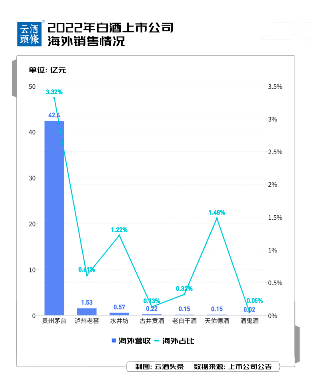 以茅臺(tái)為例,其2020年、2021年、2022年的海外營(yíng)收分別為24.32億元、26.18億元、42.40億元,近三年茅臺(tái)海外市場(chǎng)的復(fù)合增長(zhǎng)率約21%。