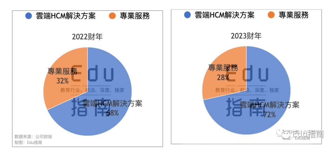 從收入占比來看,該公司云端HCM解決方案2023財(cái)年收入占比為72%,高于上一財(cái)年占比的68%。其專業(yè)服務(wù)收入本財(cái)年占比為28%,低于上一財(cái)年同期占比的32%。