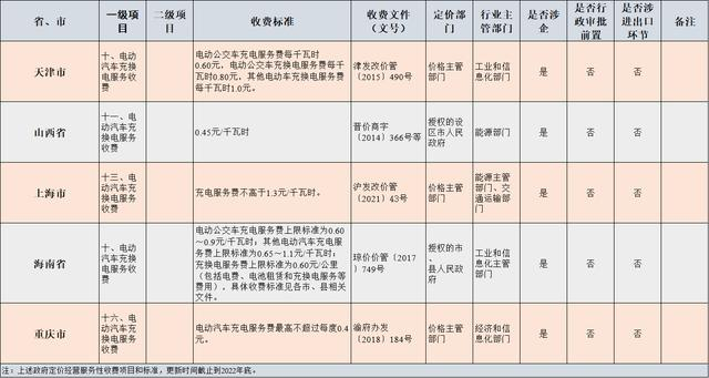 2023年1月,國家發(fā)展改革委發(fā)布了《政府定價的經(jīng)營服務(wù)性收費目錄清單(2023版)》,其中明確國內(nèi)部分省市電動汽車充換電服務(wù)費有相關(guān)的收費標準(該價格標準更新時間截至2022年底)。比如天津電動公交車充電服務(wù)費0.60元/千瓦時,其他電動車充換電服務(wù)費1.0元/千瓦時(津發(fā)改價管(2015) 490號);山西電動車充換電服務(wù)費是0.45元/千瓦時(晉價商字(2014) 366號);上海則規(guī)定不高于1.3元/千瓦時(滬發(fā)改價管(2021) 43號);海南電動公交車充電服務(wù)費上限標準為0.60-0.9元/千瓦時,其他電動汽車充電服務(wù)費上限標準為0.65-1.1元/千瓦時,充換電服務(wù)級上限標準為0.60元/公里《包括電費、電池租賃和充換電服務(wù)等費用);重慶不超過0.4元/千瓦時。