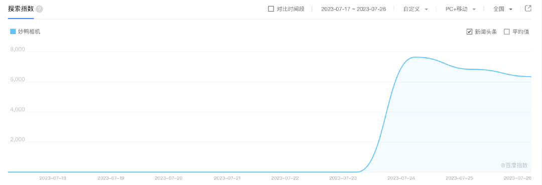 微信指數(shù)顯示,妙鴨相機(jī)在7月17日上線后的四天內(nèi),指數(shù)一直很低,第五天開始上升,在7月25日達(dá)到峰值,但從7月26日開始,指數(shù)便扭頭向下大幅下滑。它的熱度,也就維持了大概一周時(shí)間。