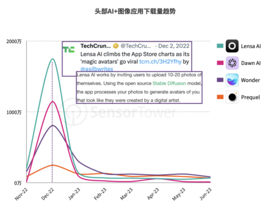 根據(jù)數(shù)據(jù)分析公司Sensor Tower的統(tǒng)計(jì),Lensa從去年11月中旬開始下載量上升,12月中旬到達(dá)頂峰,今年1月中旬回落到低水平,整個(gè)生命周期的熱度也就兩個(gè)月時(shí)間。其他頭部AI+圖像應(yīng)用也是幾乎完全相同的軌跡。