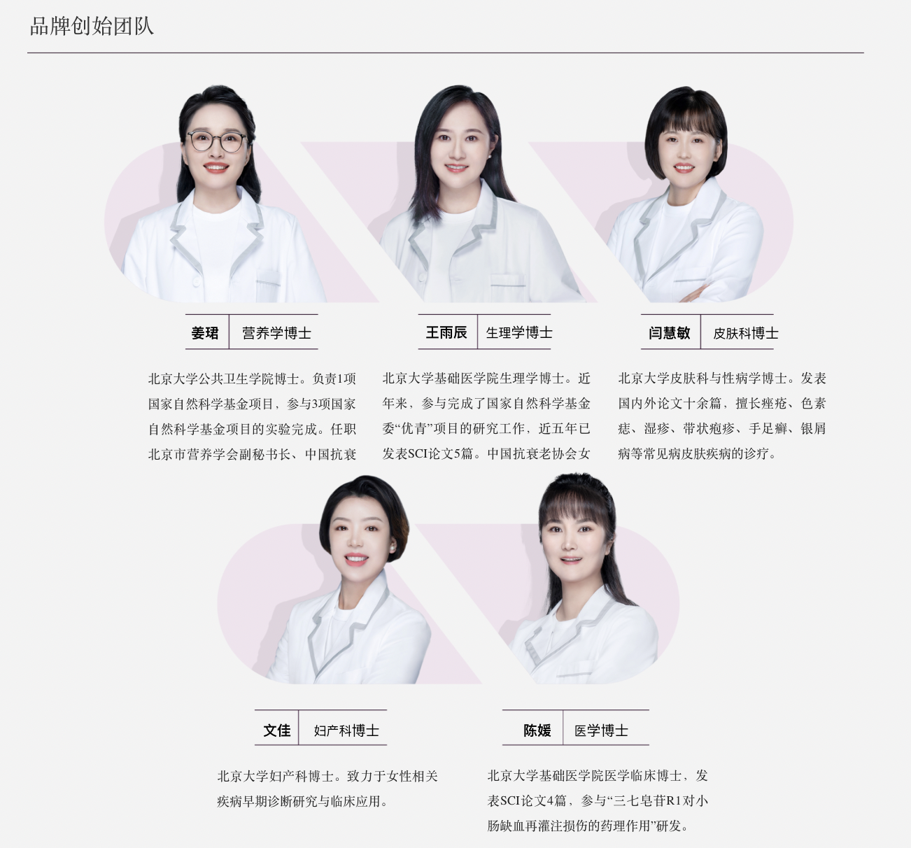 “五個女博士”官網(wǎng)顯示,該品牌創(chuàng)立于2019年7月,是北京青顏博識健康管理有限公司旗下的品牌,旗下熱門產(chǎn)品包括膠原蛋白肽維C飲品和膠原蛋白肽EGCG飲。此外,官網(wǎng)還附有五位北大醫(yī)學女博士的簡介。