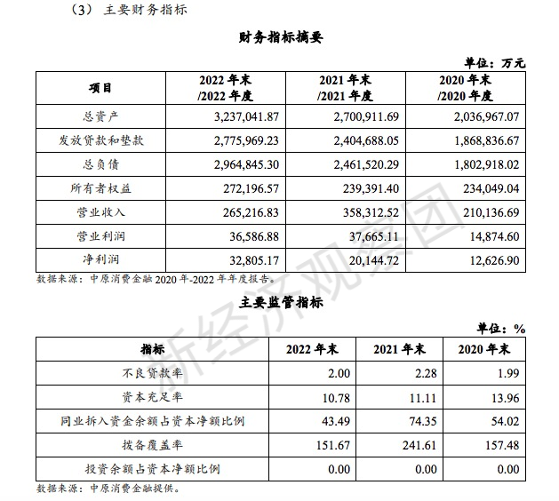 《報(bào)告》還同步披露了中原消金的業(yè)績(jī)情況。截至 2020 年末-2022 年末,中原消金總資產(chǎn)分別為 203.70 億元、270.09 億元、323.70 億元,發(fā)放貸款及墊款分別為 186.88 億元、240.47 億元、277.60 億元。
