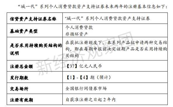 無(wú)獨(dú)有偶,7月20日,湖南長(zhǎng)銀五八消費(fèi)金融股份有限公司(下稱“長(zhǎng)銀五八消金”)發(fā)布的《“城一代”系列個(gè)人消費(fèi)貸款資產(chǎn)支持證券的注冊(cè)申請(qǐng)報(bào)告》顯示,其將在自獲準(zhǔn)注冊(cè)之日起 2 年內(nèi),將發(fā)行37億個(gè)人消費(fèi)貸款資產(chǎn)支持證券,預(yù)計(jì)發(fā)行1-4期。