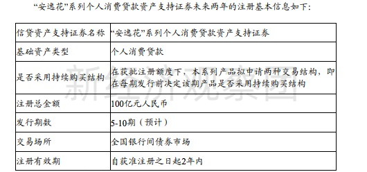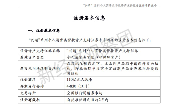 更早之前的6月30日,興業(yè)消費(fèi)金融股份公司(以下簡(jiǎn)稱“興業(yè)消金”)發(fā)布了《關(guān)于未來(lái)兩年“興晴”系列個(gè)人消費(fèi)類貸款資產(chǎn)支持證券的注冊(cè)申請(qǐng)報(bào)告》,宣布將在自獲準(zhǔn)注冊(cè)之日起2年內(nèi)發(fā)行110億元,預(yù)計(jì)發(fā)行4-8期。