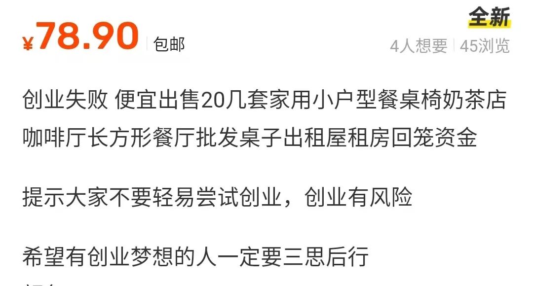 關(guān)門停業(yè)后,店鋪里的其他陳設(shè),自然也被掛上閑魚。在一篇售賣咖啡店桌椅的帖子里,賣家苦心相勸,創(chuàng)業(yè)有風(fēng)險,一定要三思而后行。