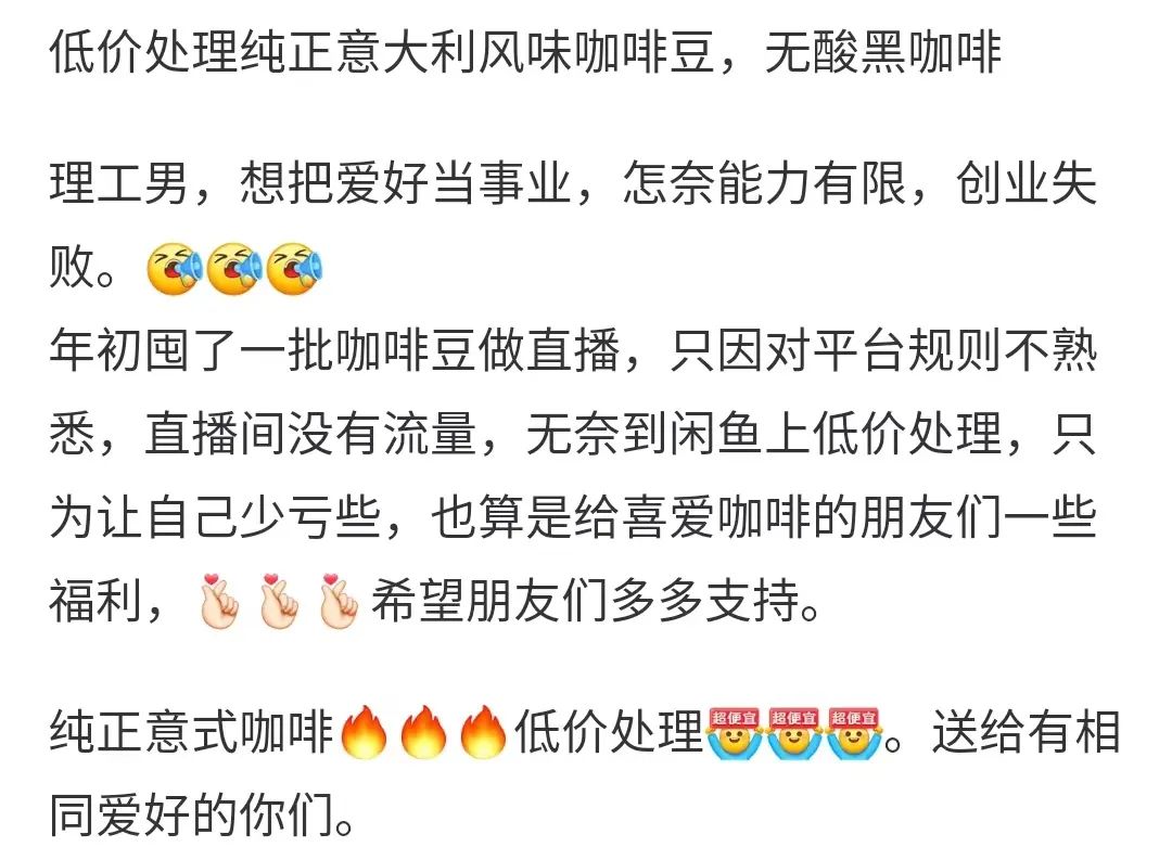 有創(chuàng)業(yè)者囤了一批咖啡豆在網(wǎng)上賣,卻發(fā)現(xiàn)自己不是做直播的料子,最后只能壓價清庫存,讓自己少虧一點(diǎn)。