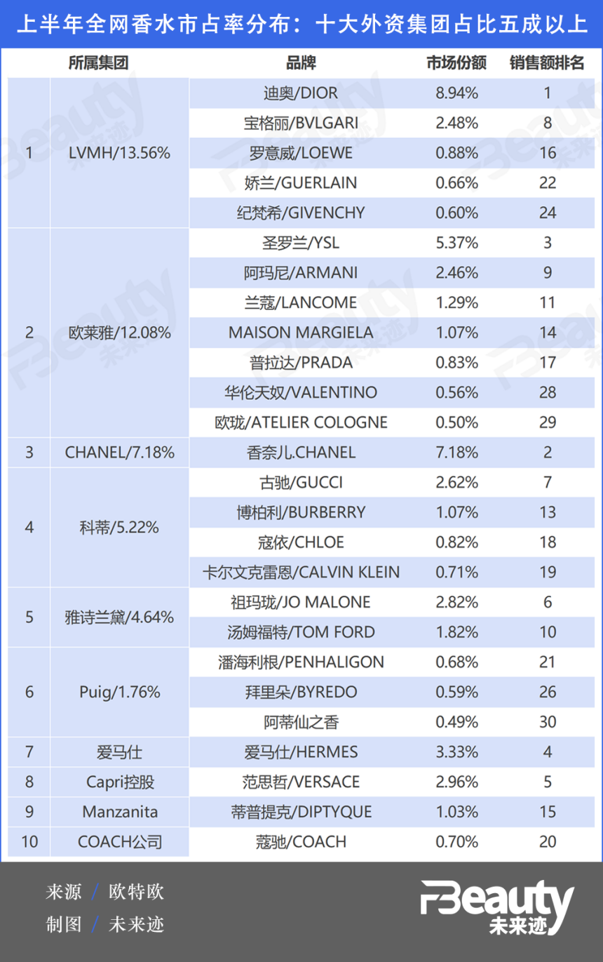 歐特歐提供的數(shù)據(jù)顯示,2023年上半年,線上全網(wǎng)排名前十的集團(tuán)分別為:LVMH、歐萊雅、香奈兒、科蒂、雅詩蘭黛、Puig、愛馬仕、范思哲控股公司Capri控股、蒂普提克母公司Manzanita以及蔻馳集團(tuán)。這些集團(tuán)僅排名在Top30的香水品牌市場份額總和就超過52%。