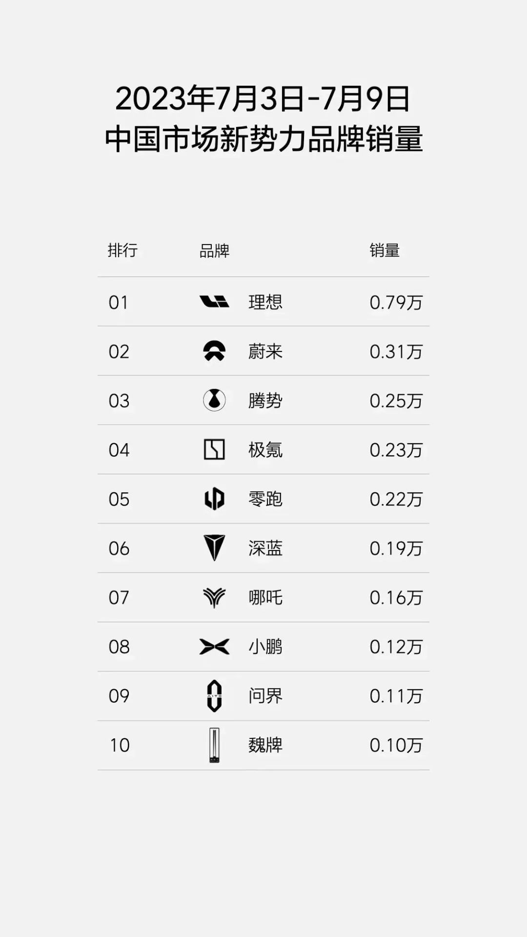 7月11日,理想官方公眾號公布7月3日至7月9日新勢力周銷量排行榜,當中理想憑0.79萬銷量居第一位,蔚來則以0.31萬居第二,小鵬當周銷量僅有0.12萬,在榜單中排第八。