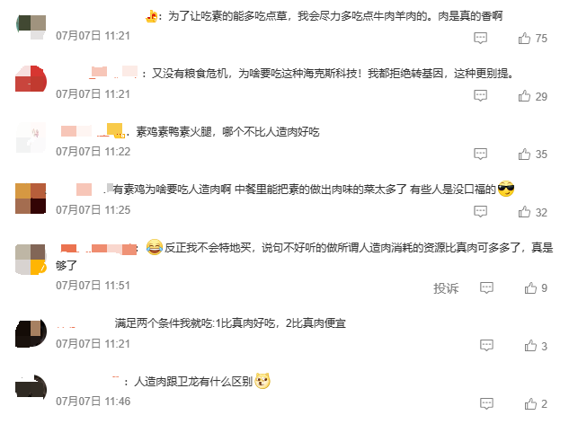從網(wǎng)絡上的輿論來看,植物肉進階到了細胞肉,人造肉確實正面對著“科技與狠活”的標簽。