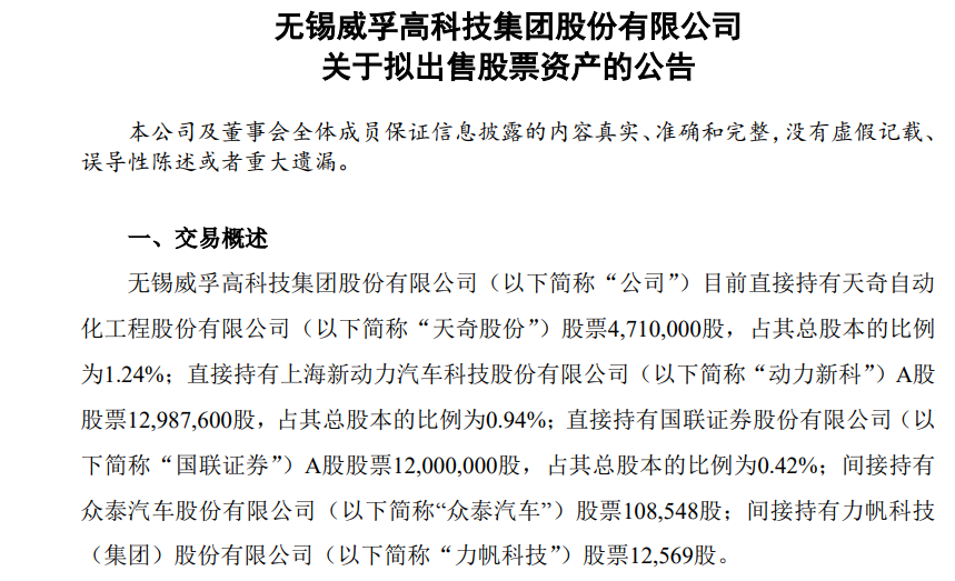 8月3日晚,威孚高科公告,擬減持持有的天奇股份(002009.SZ)、動(dòng)力新科(600841.SH)、國(guó)聯(lián)證券(601456.SH)、眾泰汽車(000980.SZ)、力帆科技(601777.SH)股票。截至8月4日,5家公司清倉(cāng)股票市值合計(jì)近3億元。