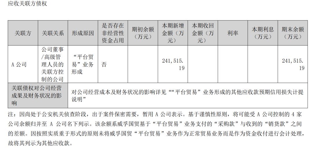最終,年報(bào)統(tǒng)計(jì),僅A公司(包括受其控制的4家公司)一方,威孚國(guó)貿(mào)基于“平臺(tái)貿(mào)易”業(yè)務(wù)支付的“采購(gòu)款”與收到的“銷貨款”之間的差額就高達(dá)24.15億元,上市公司因此新增24.15億元的其他應(yīng)收款。