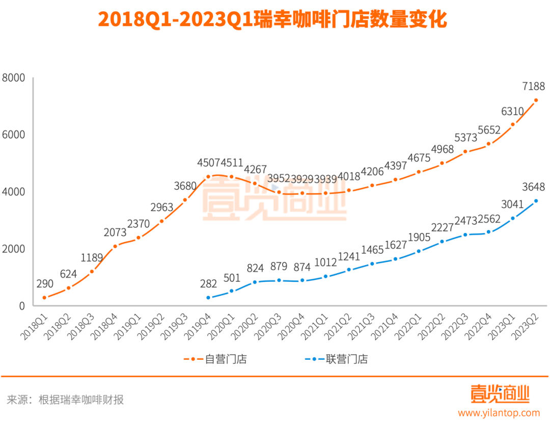 截至6月30日,瑞幸咖啡總門(mén)店數(shù)達(dá)10836家,包含7188家自營(yíng)門(mén)店和3648家聯(lián)營(yíng)門(mén)店,門(mén)店數(shù)量在連鎖咖啡品牌中已經(jīng)是獨(dú)一檔的存在,領(lǐng)先第二名的星巴克中國(guó)多達(dá)4356家。
