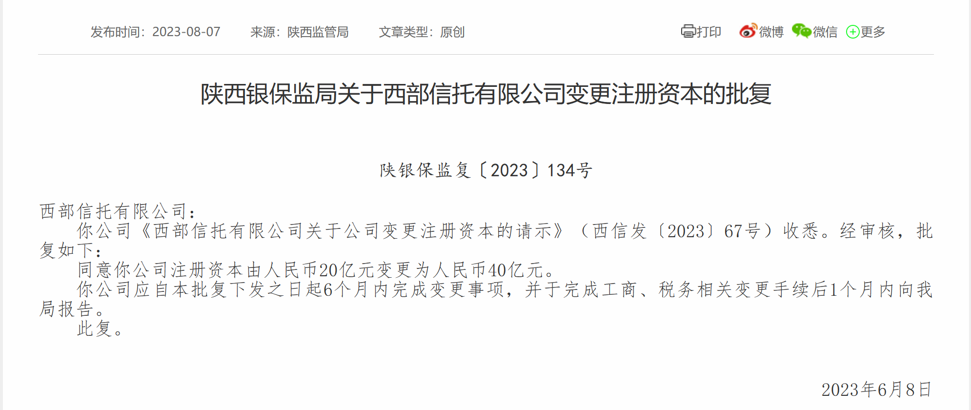 8月7日,國(guó)家金融監(jiān)督管理總局陜西監(jiān)管局(下稱:陜西監(jiān)管局)消息,陜西監(jiān)管局已同意西部信托變更注冊(cè)資本申請(qǐng),西部信托注冊(cè)資本將由人民幣20億元變更為人民幣40億元。