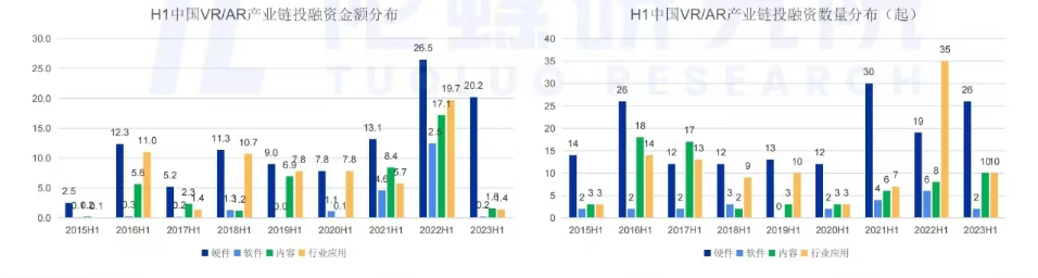 按產(chǎn)業(yè)鏈板塊來看,國內(nèi)2023年H1硬件是融資并購的重點板塊,硬件板塊融資數(shù)量為26起,同比增長36.8%;而軟件、內(nèi)容與行業(yè)應(yīng)用板塊融資額大幅下滑:上半年國內(nèi)軟件板塊融資額為0.2億元,同比下滑98.4%;內(nèi)容板塊融資額為1.6億元,同比下滑90.6%;行業(yè)應(yīng)用板塊融資額為1.4億元,同比下滑93%。