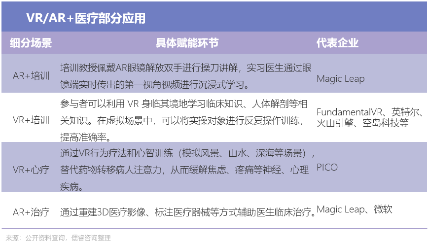 厚積而薄發(fā)。實際上,在醫(yī)療領(lǐng)域已有垂類廠商深耕多年,C端廠商大多有所布局。目前相結(jié)合的方式主要是VR/AR+醫(yī)療培訓(xùn)、治療等。