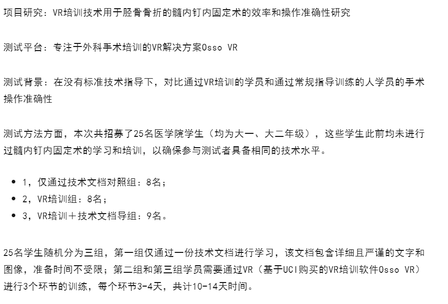 以外科手術(shù)為例,為探究“VR培訓(xùn)真的能提升手術(shù)熟練程度嗎,比傳統(tǒng)教學(xué)方式到底有多大優(yōu)勢?”等問題,芝加哥伊利諾伊大學(xué)醫(yī)學(xué)院(UIC)決定展開一項“VR培訓(xùn)技術(shù)用于脛骨骨折的髓內(nèi)釘內(nèi)固定術(shù)的效率和操作準(zhǔn)確性研究”測試。