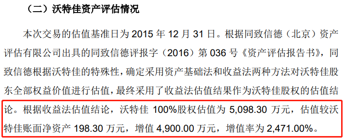 根據(jù)同致信德(北京)資產(chǎn)評(píng)估有限公司出具的《資產(chǎn)評(píng)估報(bào)告書》,標(biāo)的資產(chǎn)截至交易基準(zhǔn)日的收益法評(píng)估值為5098.30萬(wàn)元。雙方確認(rèn),標(biāo)的資產(chǎn)的交易對(duì)價(jià)參照前述評(píng)估值確定為4800萬(wàn)元。交易對(duì)價(jià)較深圳沃特佳2015年賬面凈資產(chǎn)198.3萬(wàn)元溢價(jià)超2300%。