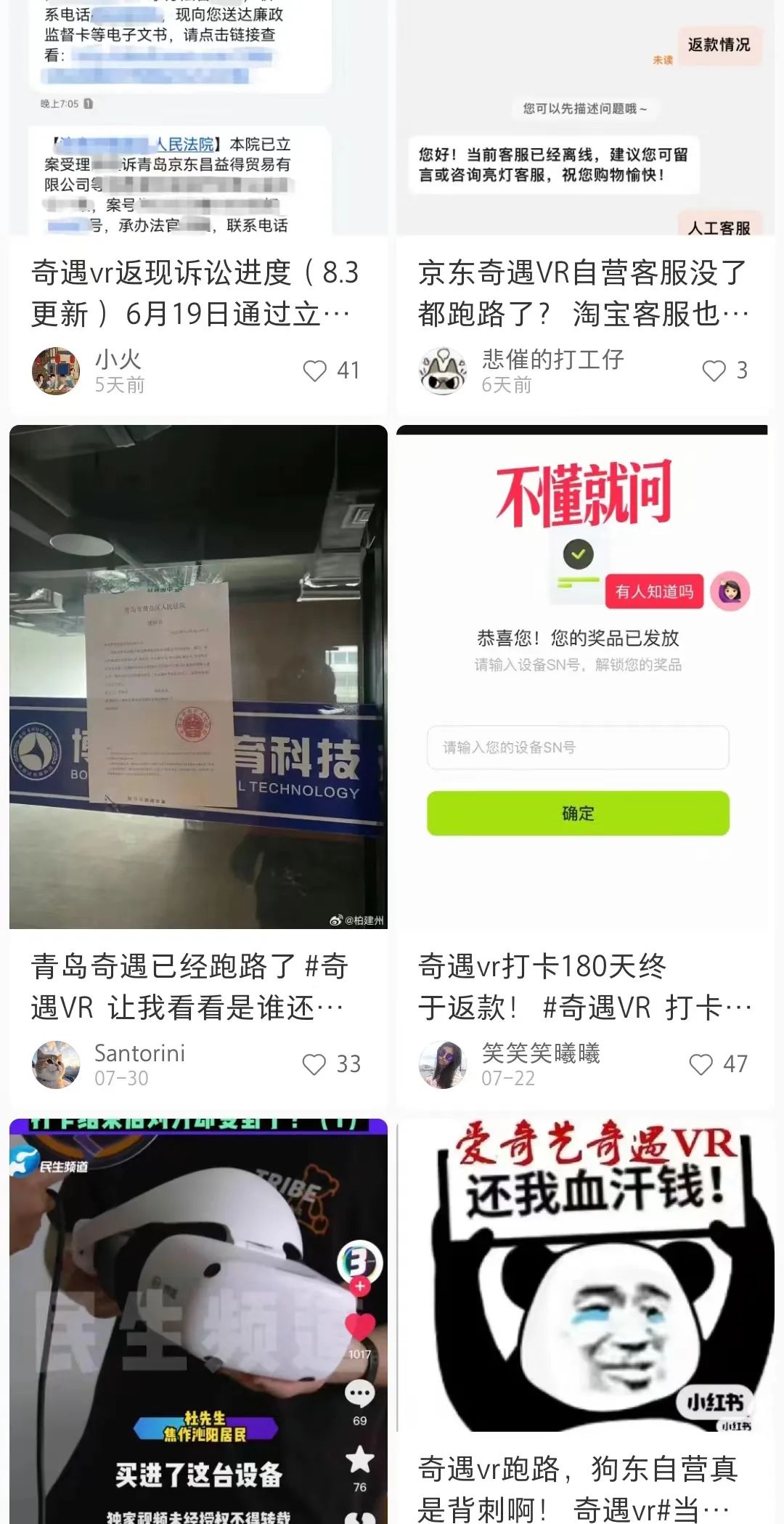 與此同時(shí),在小紅書、微博、抖音上,大批去年購(gòu)買奇遇VR頭顯設(shè)備,并參加“連續(xù)打卡300天或180天即返現(xiàn)3000元或2799元購(gòu)物卡”活動(dòng)的用戶發(fā)帖投訴,稱奇遇VR拖欠返現(xiàn),不少用戶已經(jīng)通過(guò)法律途徑起訴奇遇,要求其“還血汗錢”,有人維權(quán)成功,但仍有不少人失望而歸。