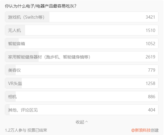 佐證之一便是VR吃灰,在新浪科技5月發(fā)起的“你認(rèn)為什么電子/電器產(chǎn)品最容易吃灰?”的投票中,共有1.2萬(wàn)人參與,其中約10%的人選擇了VR頭盔,其余高票選項(xiàng)還有Switch、無(wú)人機(jī)等。