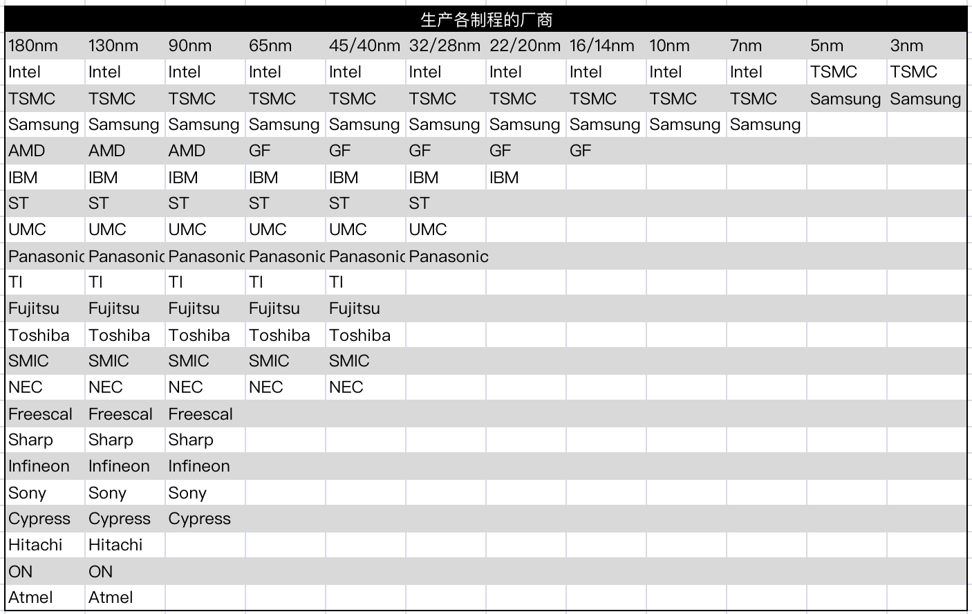 臺積電就沿著晶體管縮小這條路徑屢試不爽,始終保持著行業(yè)領先。從180nm到3nm,臺積電用20年時間熬走了99%的競爭對手。尤其28nm后,在FinFET技術上逐步甩開競爭對手,14nm以下基本處于市場壟斷地位。