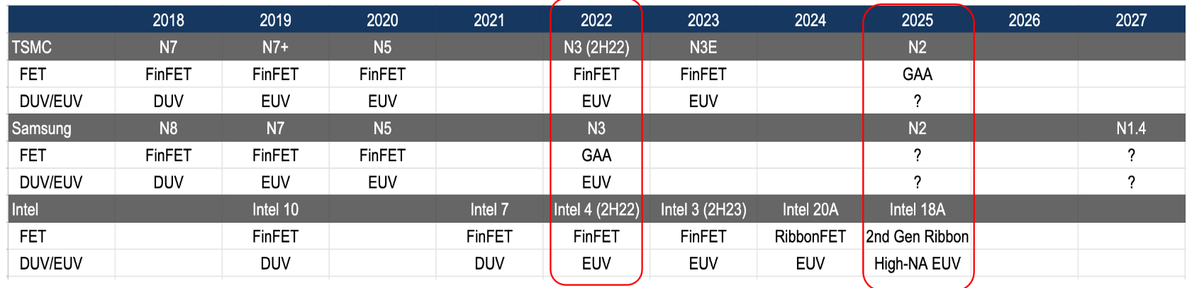 而從規(guī)劃來看,臺積電、三星和英特爾不約而同的搞起了制程競速賽,雖然大的時間節(jié)點都是2022-2023年進入3nm、2025年進入2nm商業(yè)化階段。但細微處仍有不同: