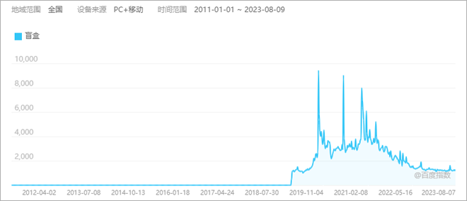 盲盒的火熱是從數(shù)據(jù)層面上看是從2019年開始的。百度指數(shù)2019年底到2022年初為盲盒搜索指數(shù)高峰期,之后便有下降的趨勢。當人們對盲盒的關注日漸降低,也預示著盲盒經(jīng)濟也開始走向下坡路。