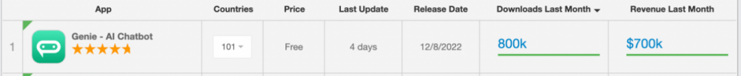 另一個類似的名為Genie-AI ChatGBT,收取用戶每周7美元或每年70美元的訂閱,在過去的一個月里積累了近70萬美元的收入。