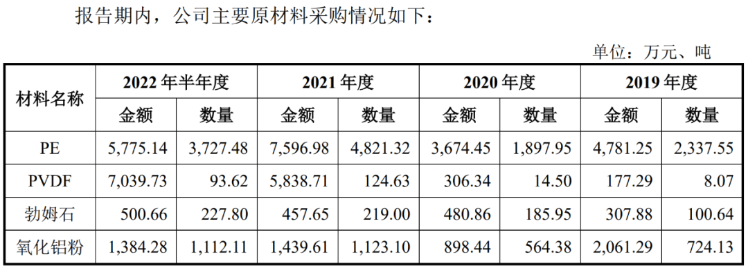 為什么說恩捷股份的出手直奔要害?仔細(xì)讀一遍金力股份的招股書,答案會很清晰。2022年H1金力股份采購的主要原材料: