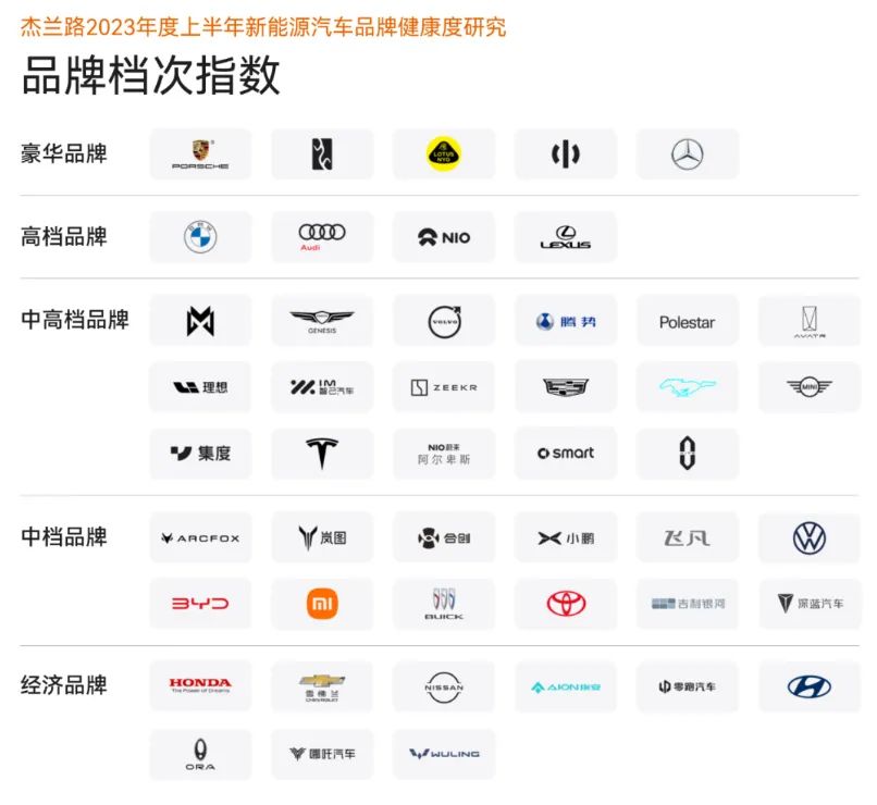 2023上半年汽車品牌檔次指數(shù)數(shù)據(jù),圖源《2023年度上半年新能源汽車品牌健康度研究》