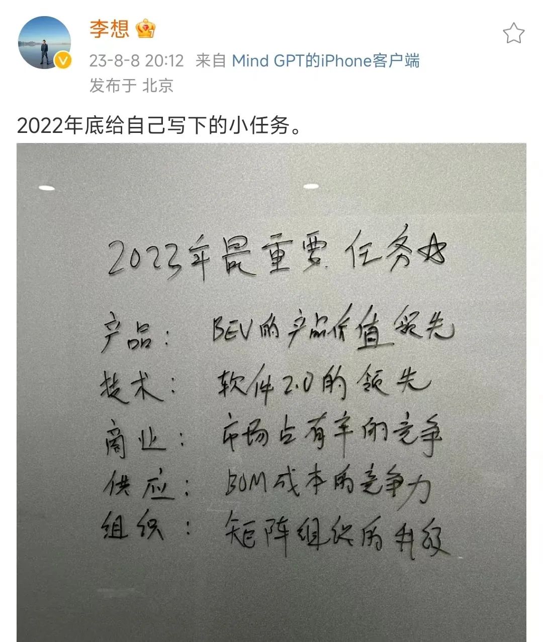 李想寫給自己的五大目標(biāo),截圖自李想個人微博