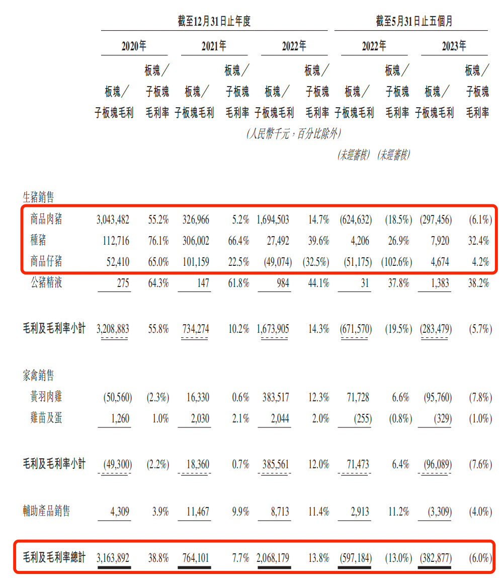 與此同時(shí),商品仔豬的毛利率由2020年的65%下滑至2023年前五月的4.2%;公豬精液的毛利率由2020年的64.3%下降至2023年前五月的38.2%。