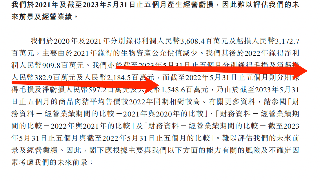 就在2023年前五月,德康農(nóng)牧仍處在虧損的狀態(tài)。截至2023年5月31日,公司錄得毛損及凈虧損分別為3.829億元和21.85億元。