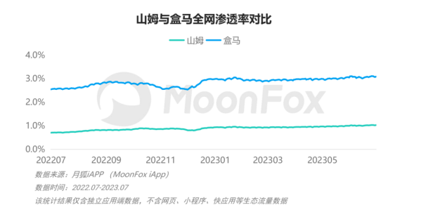 一方面,盒馬與山姆的用戶群體,重合度很高,二者是典型的“友商”;另一方面,盒馬的全網滲透率、月活等數據領先于山姆,難怪會這么遭忌憚。