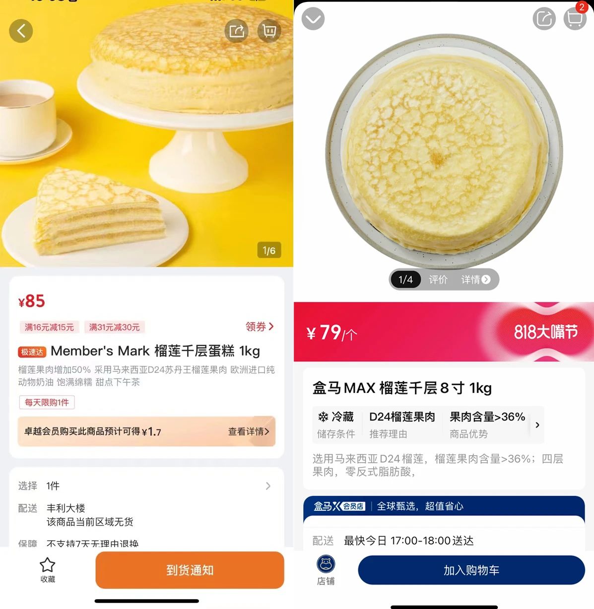 要說當下的網紅“炸子雞”無疑是榴蓮千層。山姆最開始標價一個128元,而同樣規(guī)格,盒馬曾賣79元/個。不過,現在山姆的線上已經找不到這款榴蓮了,看來也是玩不動了。