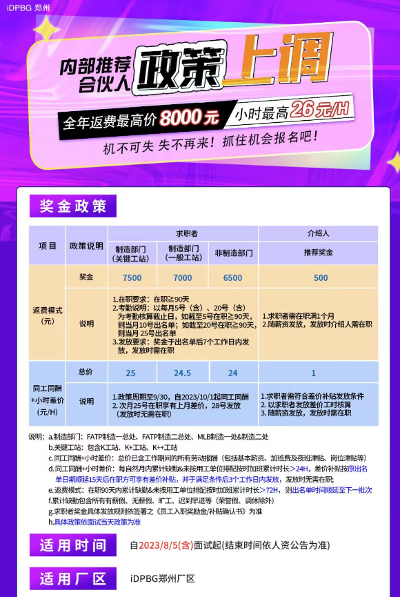 8月15日,“鄭州富工聯(lián)招聘”微信公眾號發(fā)布招募信息,高價延期,鄭州富士康26元/小時,或者返費8000元招聘(返費條件包括一定在職時長/打卡天數(shù))繼續(xù)。招聘海報顯示,8月4日,企業(yè)官方公布告知市場:今年市場最高價已敲定,并且消息很快傳播河南市場。