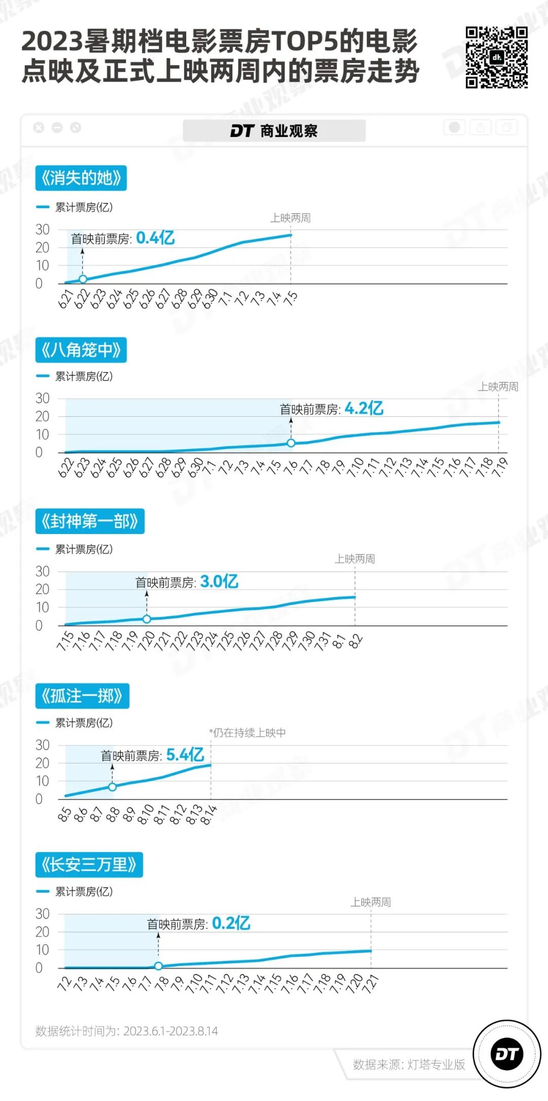 從暑期檔票房TOP 5的電影走勢來看,除了《消失的她》《孤注一擲》這種上映前就宣發(fā)到位、鋪墊充足的影片外,《八角籠中》《封神第一部》《長安三萬里》,都經(jīng)歷了先抑后揚,票房逆勢上漲。