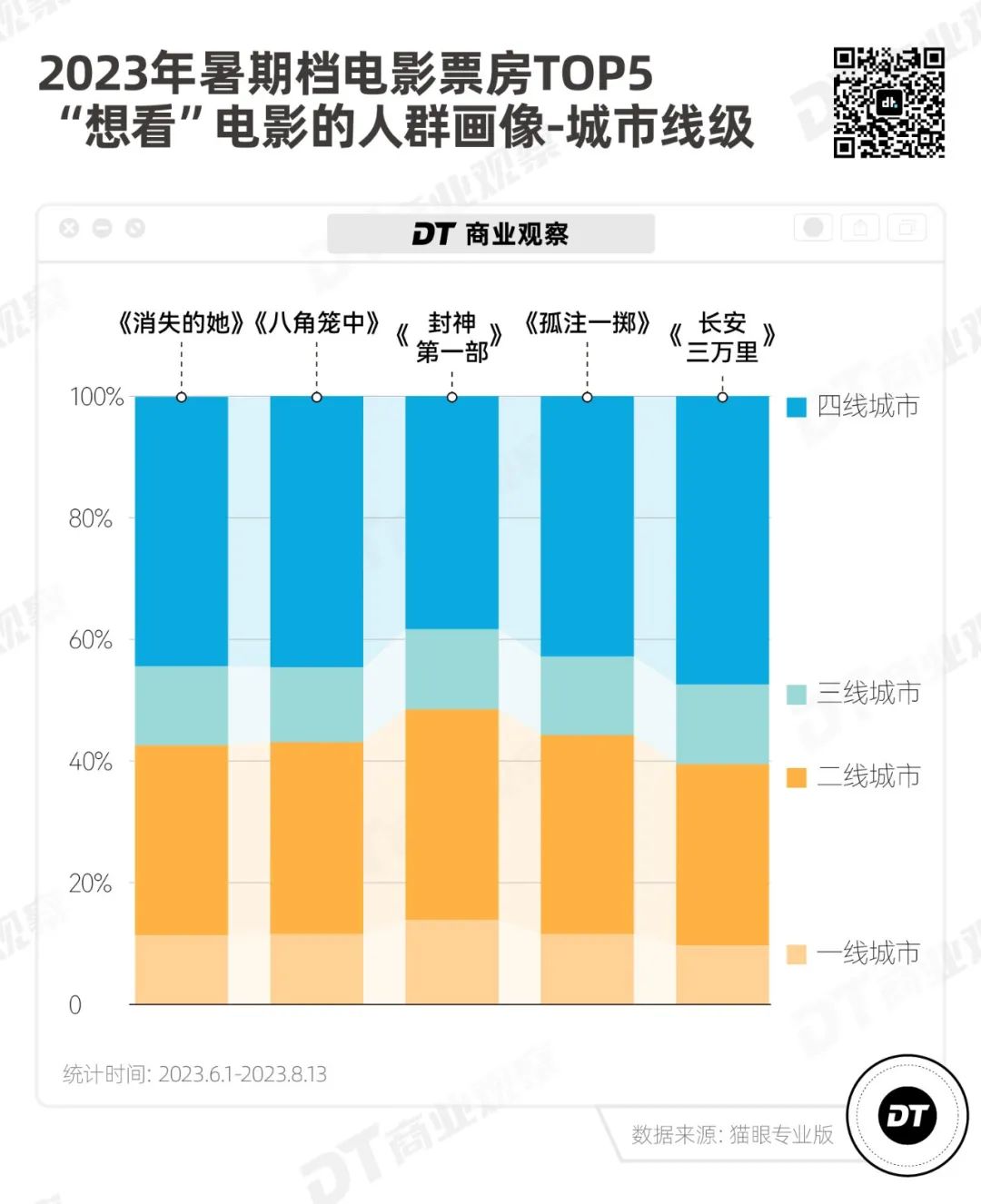 根據(jù)貓眼專業(yè)版的數(shù)據(jù),今年暑期檔電影票房TOP 5的電影中,貓眼“想看”的人群畫像是高度相似的,人群占比最高的城市線級是四線城市,占比都接近或超過4成。