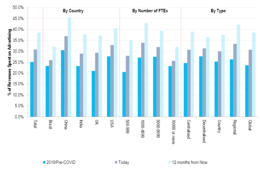 與此同時(shí),CMO的調(diào)查進(jìn)一步表明,社交媒體平臺(tái)的整體廣告預(yù)算分配將會(huì)增加。從對(duì)受訪者的調(diào)查來看,疫情前這一比例為24.4%,而如今的廣告分配將達(dá)到31.5%,一年后或?qū)⑸仙?7.8%。
