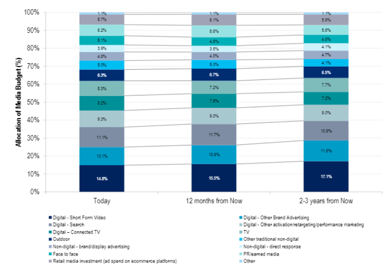 第二個(gè)重要的發(fā)現(xiàn)是,短視頻不僅仍然是最大的單一廣告投放形式,而且是在12個(gè)月和36個(gè)月的時(shí)間里繼續(xù)占據(jù)廣告市場份額的兩個(gè)類別之一,這兩個(gè)類別中的另一個(gè)是“數(shù)字/其他品牌廣告”。花旗團(tuán)隊(duì)表示,令人驚訝的是,其他形式的數(shù)字營銷,尤其是搜索和效果營銷(Search and Performance Marketing),在未來2-3年內(nèi)所占的比例份額將逐漸減少。