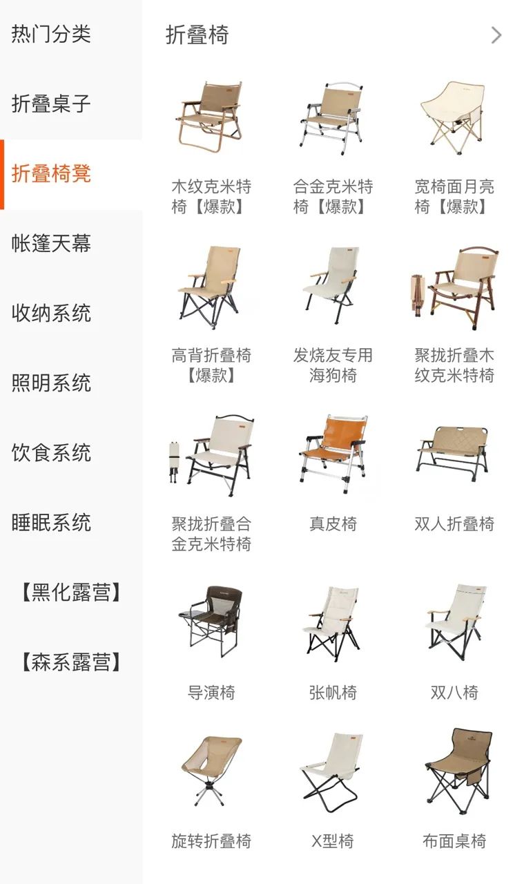 因為椅面更為寬大、舒適度更高,名字又帶著些俏皮,海狗椅成為戶外折疊椅中新寵,還被業(yè)內(nèi)譽為戶外座椅中最舒適的產(chǎn)品之一。目前在不少戶外用品品牌店鋪中也能看到海狗椅。初看之下,這些產(chǎn)品造型大同小異,有些還能調(diào)節(jié)檔位,定價從70多元到1500元不等。