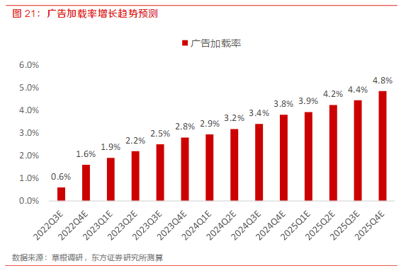 東方證券的研報(bào)分析也印證了這一點(diǎn),其預(yù)估視頻號(hào)廣告加載率最終目標(biāo)可以達(dá)到10%,但這個(gè)過程比較緩慢,預(yù)測2023/2024/2025年Q4視頻號(hào)廣告加載率將分別為2.8%、3.8%、4.8%。