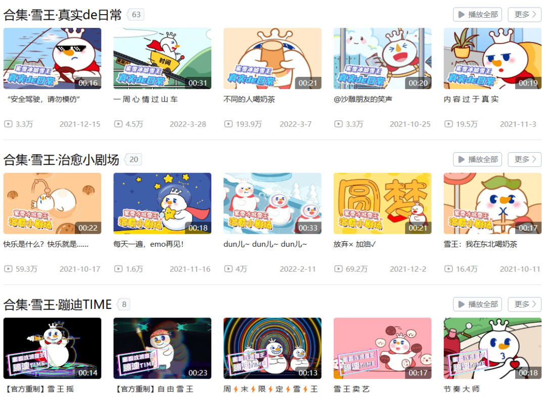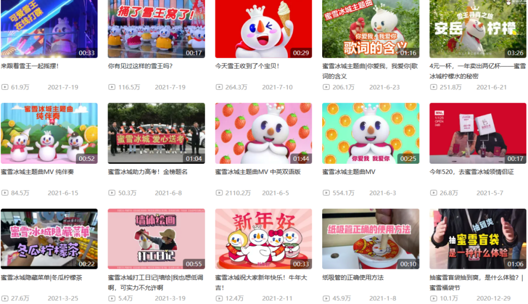主題曲的迅速走紅,也讓全程參演MV的雪王受到更多關(guān)注,在蜜雪冰城營銷宣傳中,雪王不只是符號化形象,更是作為品牌自己的流量明星單獨運營。