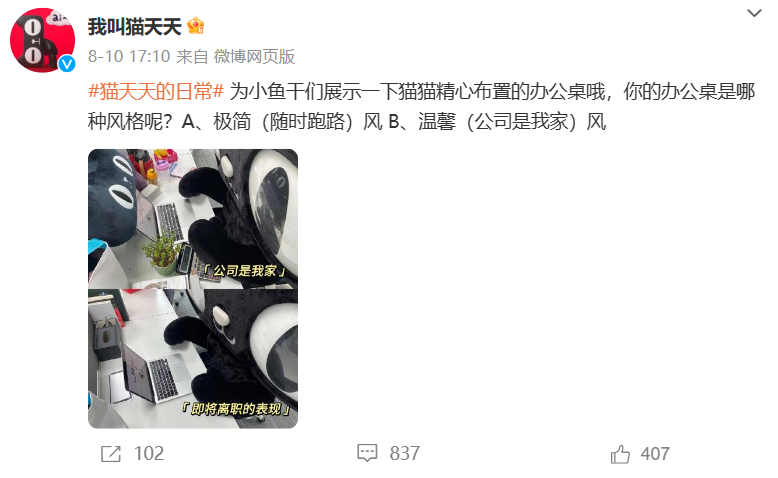 除了消費品品牌,互聯(lián)網(wǎng)企業(yè)天貓、釘釘也嘗試著跨界合作,通過動畫賦予品牌IP故事、性格、喜好,從而讓用戶多角度認識品牌,提升認同感。前者新推角色貓耳少女“喵醬”在動畫中的活潑可愛備受年輕觀眾喜愛;后者針對職場現(xiàn)象的吐槽、玩梗輕松引起觀眾共鳴。
