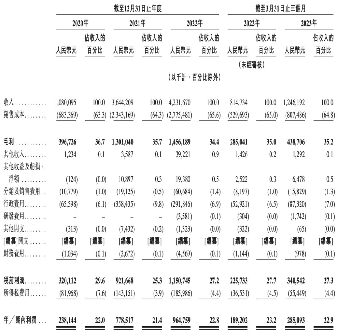 招股書(shū)顯示,2020年至2023年一季度,茶百道實(shí)現(xiàn)營(yíng)收10.80億元、36.44億元、42.32億元和12.46億元;同期凈利潤(rùn)分別為2.38億元、7.79億元、9.65億元和2.85億元。