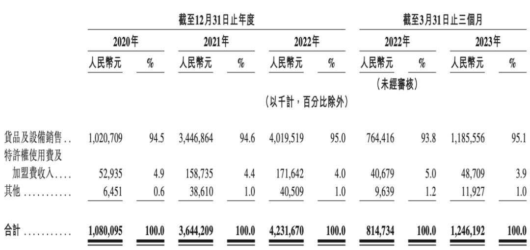 其中,向加盟店銷(xiāo)售貨品及設(shè)備是茶百道最核心的收入來(lái)源。2020年至2023年一季度,茶百道來(lái)自銷(xiāo)售貨品及設(shè)備的收入占總收入比例均在93%至95%之間。
