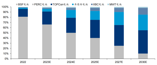 2022-2030年不同電池技術(shù)路線市場占比變化趨勢預(yù)測圖;資料來源:CPIA,華泰研究