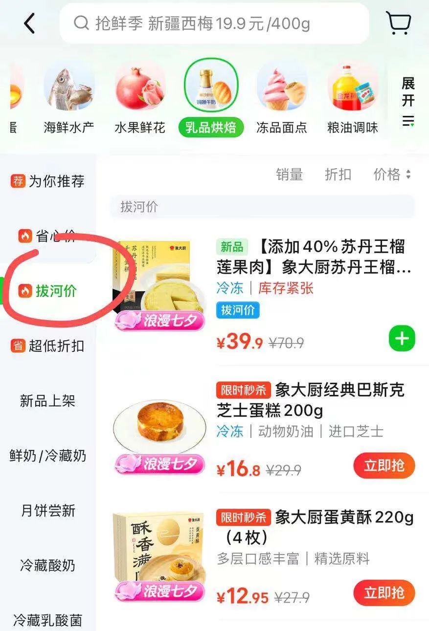 不過,有消費者發(fā)現(xiàn),8月15日,美團買菜悄然上線了“拔河價”,集中于榴蓮千層蛋糕、麻薯面包和瑞士卷等消費者熟悉的烘焙品。河,顯然指向盒馬。“更快、更好、更低價”的宣傳語也對標了盒馬的“更多、更鮮、更實惠”。