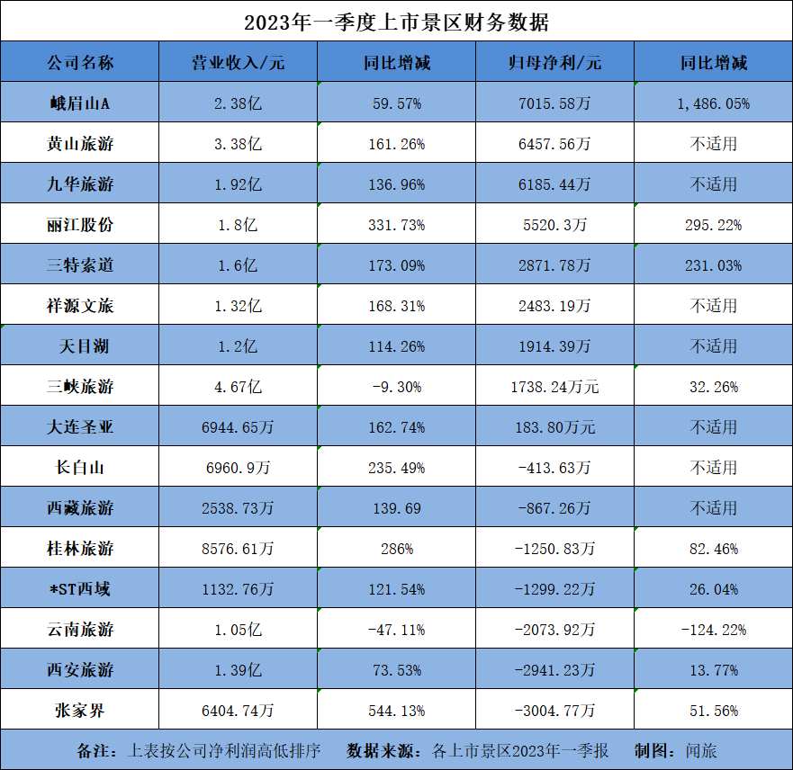 其中景區(qū)類企業(yè)中一季度凈利潤(rùn)前三甲分別為峨眉山A、黃山旅游和九華旅游,2023年一季度實(shí)現(xiàn)歸母凈利潤(rùn)分別為7015.58萬元、6457.56萬元和6185.44萬元,較比去年同期大幅增加。